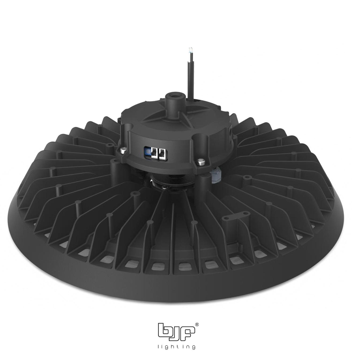 Esta campana LED integra un sistema de conmutador de encendido y CCT que permite seleccionar tres potencias: 200W, 160W o 120W, así como tres temperaturas de color: 3000K, 4000K y 6000K, ajustables mediante selector incorporado.