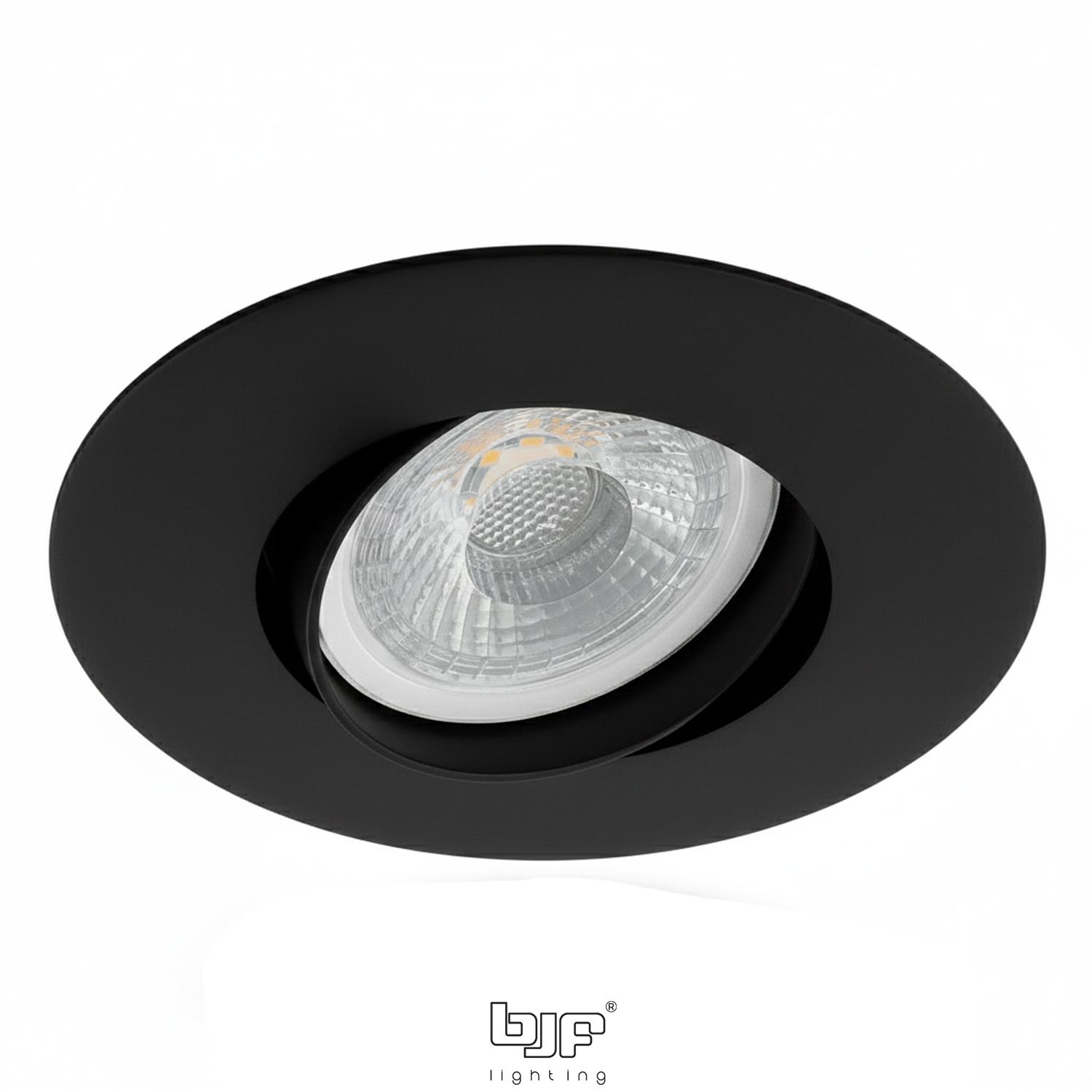 Pack compuesto por spot empotrable redondo basculante de Ø80 mm en acabado negro mate y bombilla LED GU10 SMD regulable de 7W con lente de 38º y temperatura de color 3000K. Una solución completa de iluminación interior de acento que combina un haz preciso, luz cálida equilibrada y control de intensidad con una estética contemporánea y discreta.