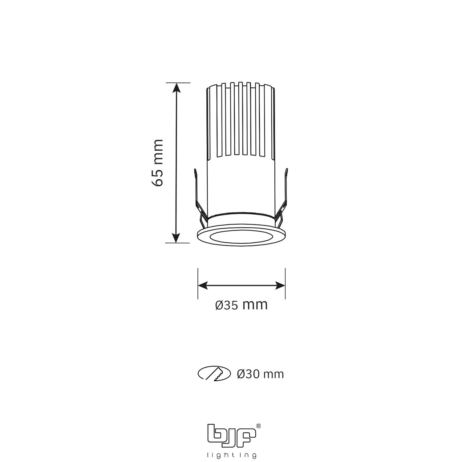 Se recomienda realizar un corte de Ø30 mm y dejar una profundidad mínima de 65 mm para una correcta instalación. Comprobar siempre la compatibilidad del regulador TRIAC antes de la conexión. Evitar cubrir el foco con materiales no transpirables y mantener ventilación adecuada. Su acabado blanco mate se integra perfectamente en techos blancos, ofreciendo una estética limpia y homogénea.