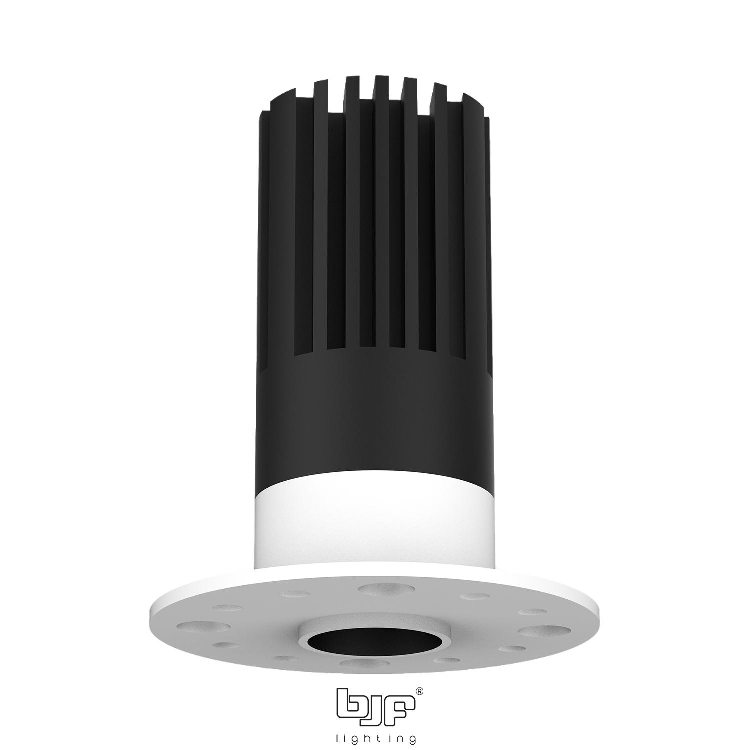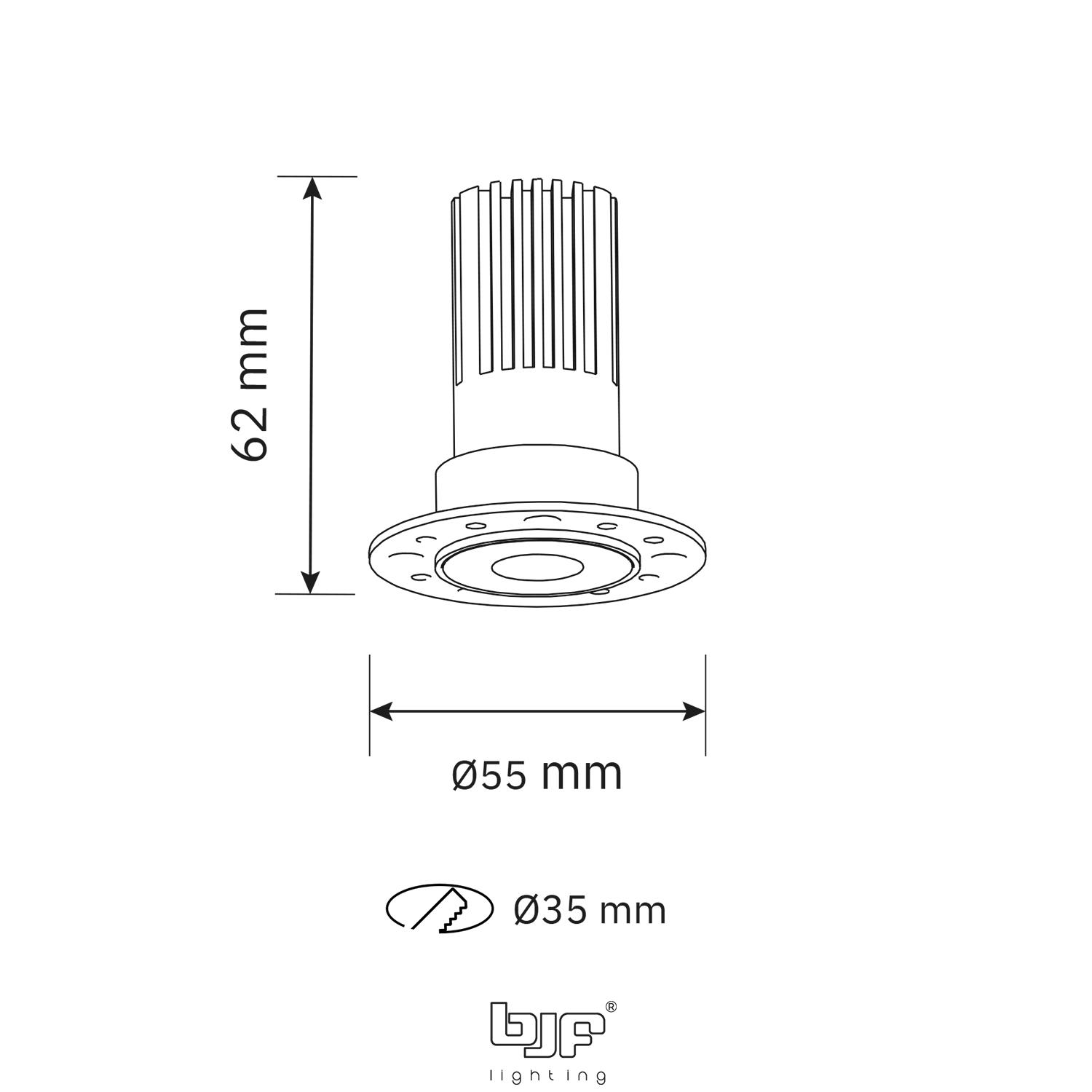 Se recomienda realizar un corte de Ø30–35 mm en el falso techo, dejando una profundidad mínima de 62 mm. El sistema trimless requiere una instalación empotrada previa a la pintura o acabado final del techo, para conseguir una integración perfecta. Asegurar la compatibilidad del regulador TRIAC si se desea control de intensidad.
