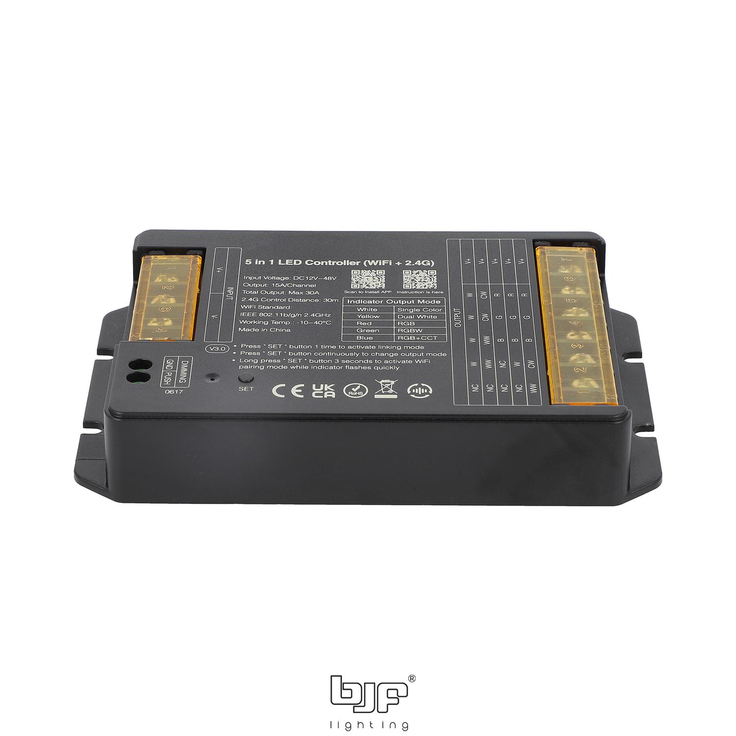 El Controlador WiFi 5 en 1 IP20 12-48V 30A RGBCCT es un dispositivo de alto rendimiento diseñado para ofrecer control total sobre la iluminación LED en aplicaciones tanto residenciales como industriales. Con una frecuencia inalámbrica de 2.4G, este controlador permite una conexión rápida y estable a través de tecnología WiFi, facilitando la gestión de la iluminación desde tu smartphone. Es compatible con una amplia gama de sistemas de iluminación, como monocolor, CCT, RGB, RGBW y RGBCCT, brindando flexibilidad y personalización. Su voltaje de entrada de 12V-48V DC y potencia de salida de 360W-1440W aseguran una amplia gama de aplicaciones, mientras que su alcance de 30 metros proporciona control remoto eficiente a distancia. Este controlador es ideal para instalar en sistemas de iluminación modernos, ofreciendo comodidad y eficiencia sin necesidad de cables adicionales.